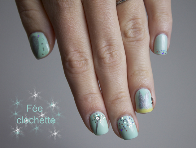 Je ne voulais pas partir dans une manucure galère où j’allais passer des heures et des heures à essayer de dessiner la fée clochette. Comme vous commencez à me connaître, vous pouvez supposer que je suis partie vers quelque chose d’épuré mais j’ai rajouté un petit défi perso.